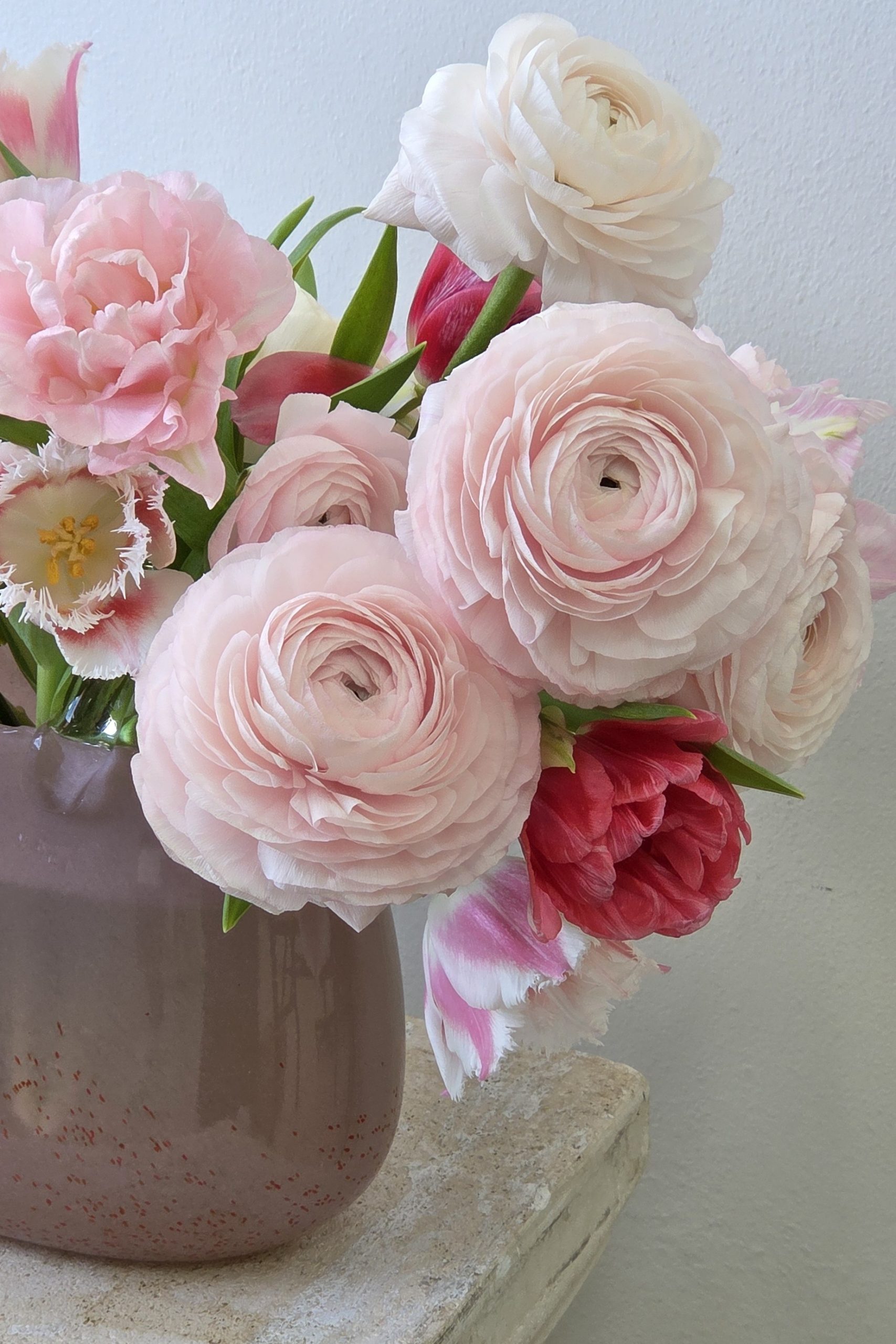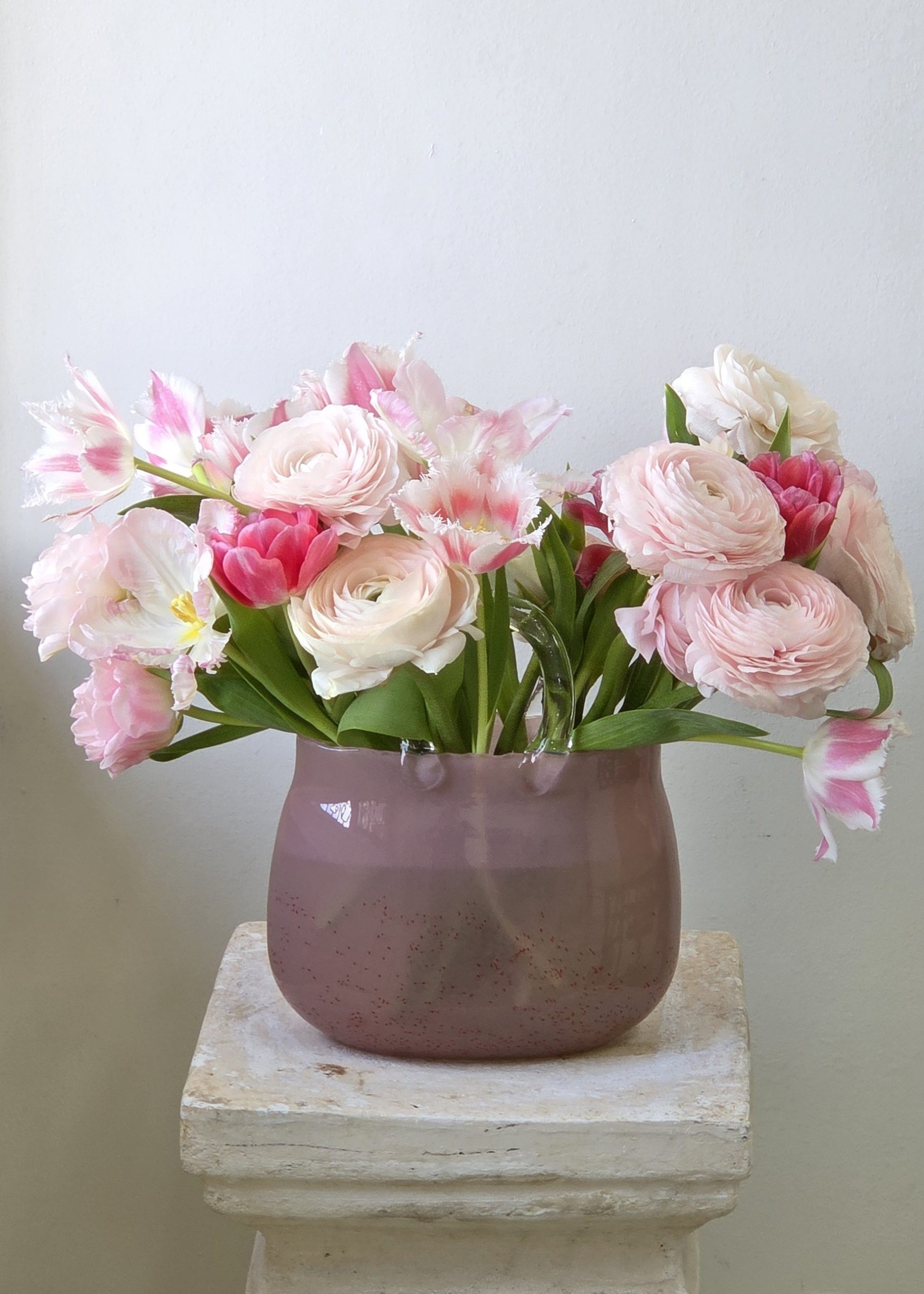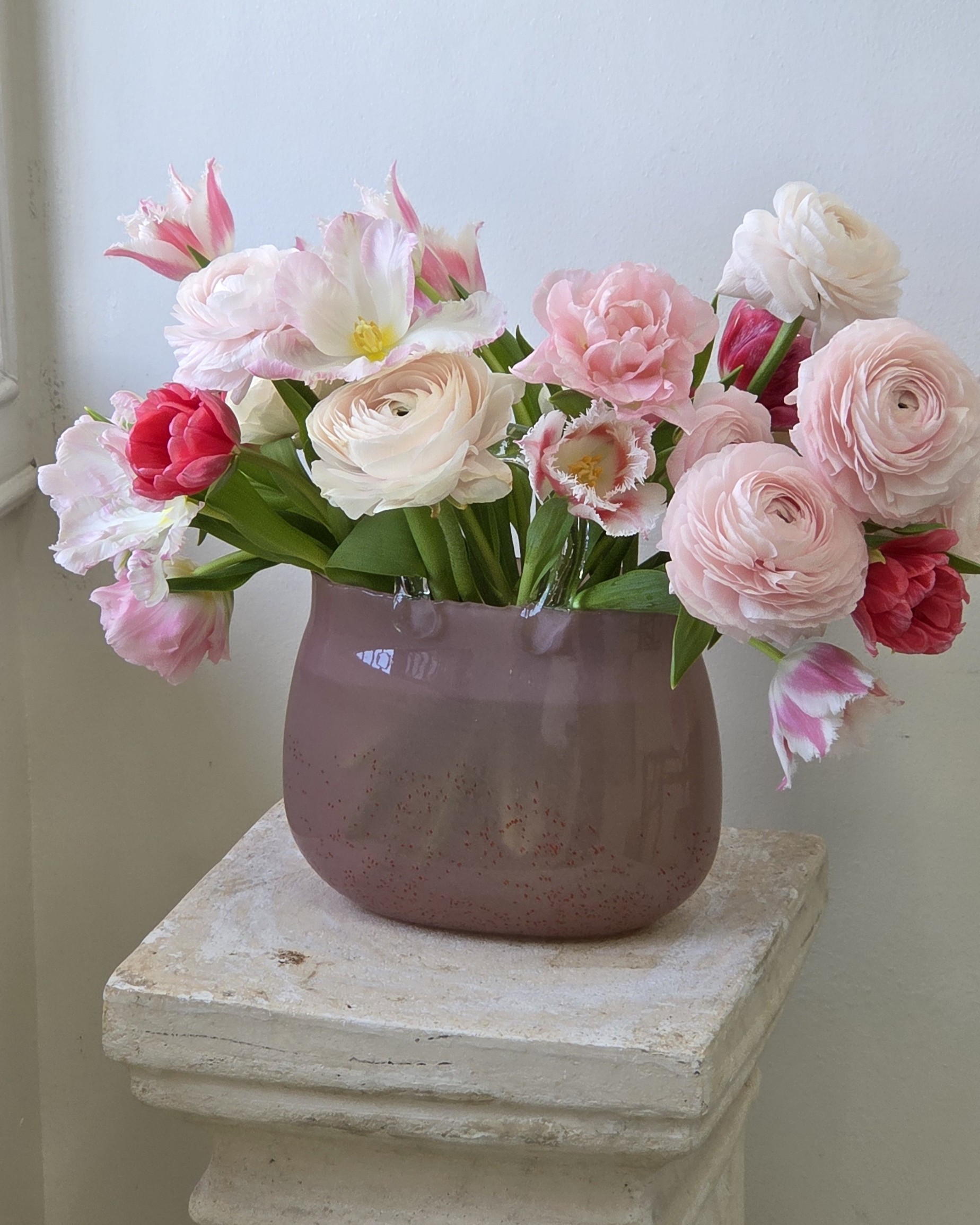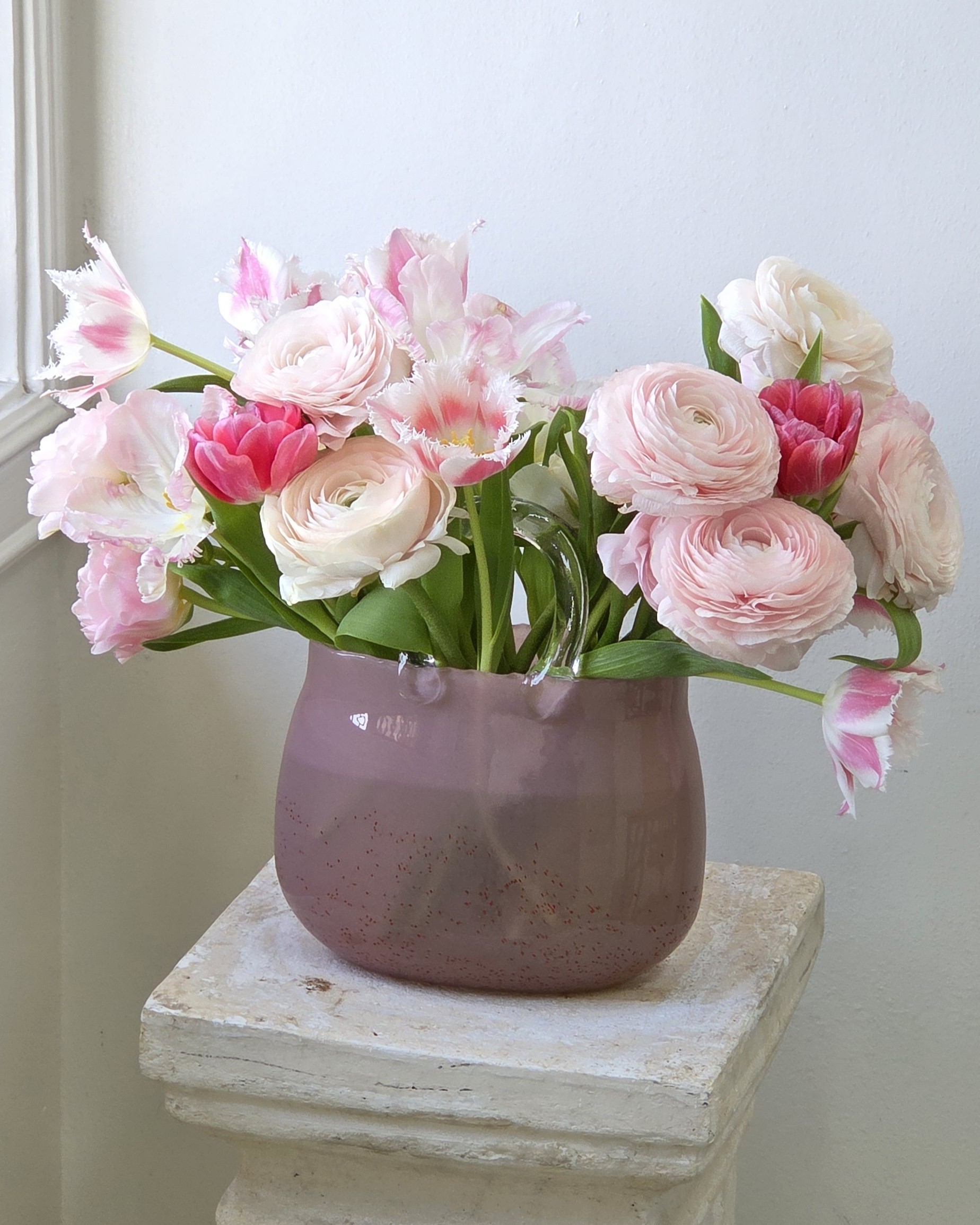 This limited website-exclusive vase arrangement will be made in the large Strawberry vase. It will have approximately 25 tulips and 10 ranunculus. These tulips will be a mix of double, possibly frilly, possibly parrot tulips. We will maintain a pink palette, but may add some reds. Tulip varieties MAY change. Ranunculus will be pink and blush salmon cloni types.