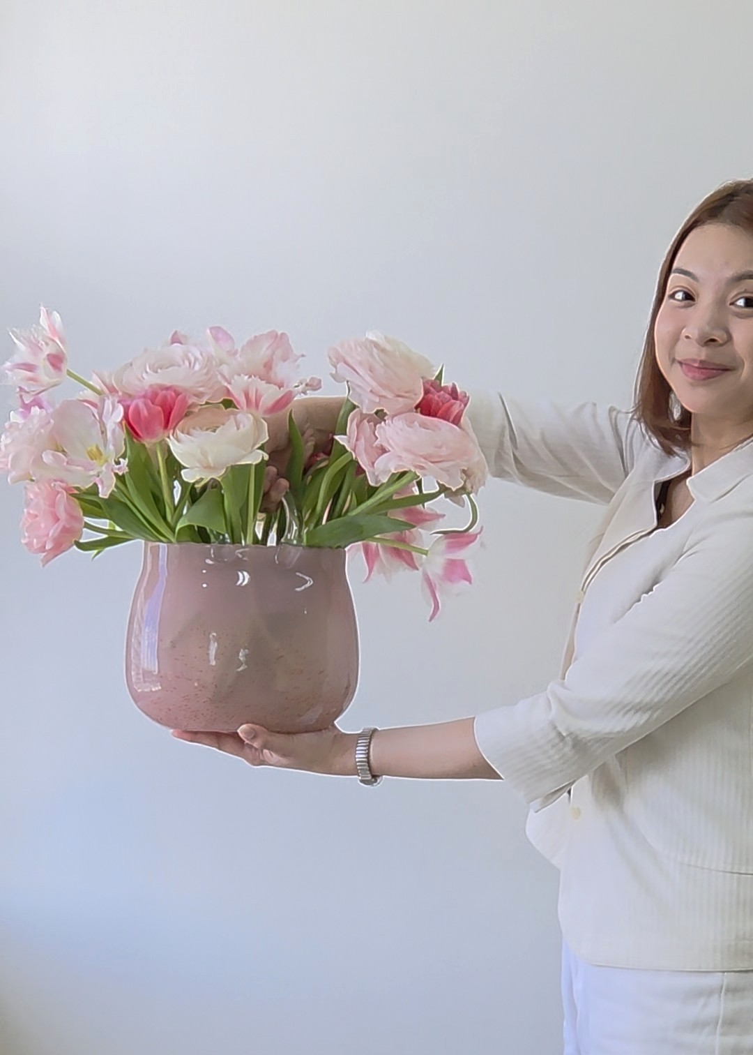 The above photo is a sample of the Small Strawberry Big set. The photo has 21 tulips and 8 ranunculus. Ergo, the actual will have more. Also, we might cut some tulips shorter so that the vase will look fuller. Tulips will lengthen in the vase with time. (yes it’s like they’re still growing) For sample video footage, please Whatsapp/Viber us. You may also find it on Instagram.